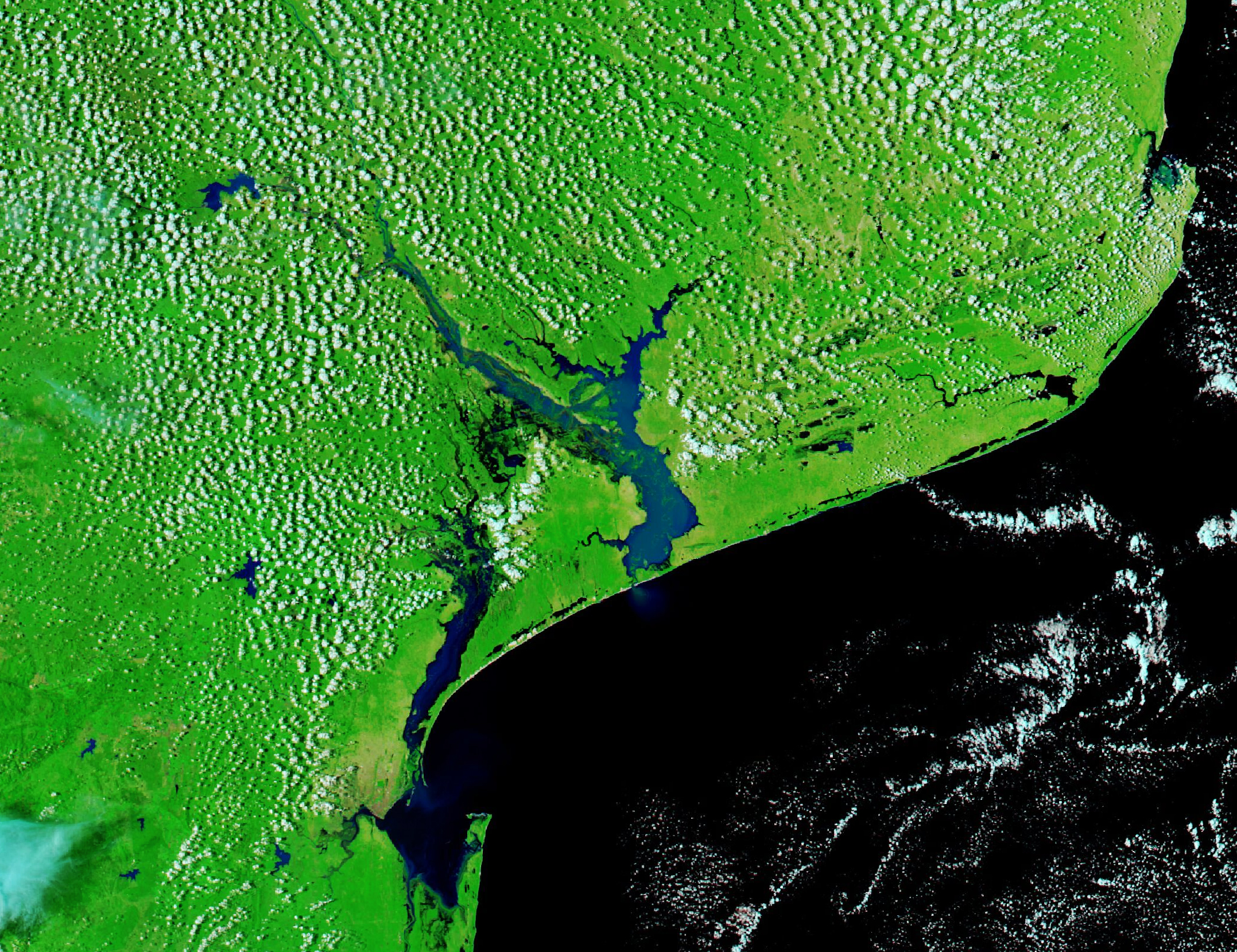 The MODIS (Moderate Resolution Imaging Spectroradiometer) on NASA’s Aqua satellite captured this false-color image (bands 7-2-1) of floodwaters coursing down the two rivers on January 25, 2026 (right). The image on the left, captured by the Terra satellite, shows the same area on December 17, 2025, before the flooding. A natural-color version of the image shows thick plumes of water rich in suspended sediment flowing down the rivers and into the Mozambique Channel.